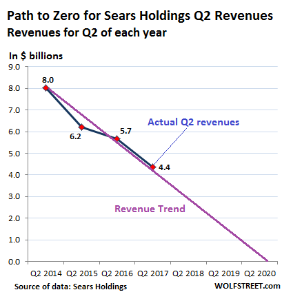 Over the past three years, the momentum of the revenue decline has accelerated sharply. Q2 revenues have plummeted from $8.0 billion in 2014 to $4.37 billion in 2017. A decline of $3.6 billion, or 45% in three years. This chart shows Q2 revenues from 2014 to 2017, with the trend line (purple) extended until it hits zero. This is the same track that Q1 revenues are on. As I’d postulated three months ago, at this rate, revenues of the once largest retailer in the US will be zero in three years, or by 2020: