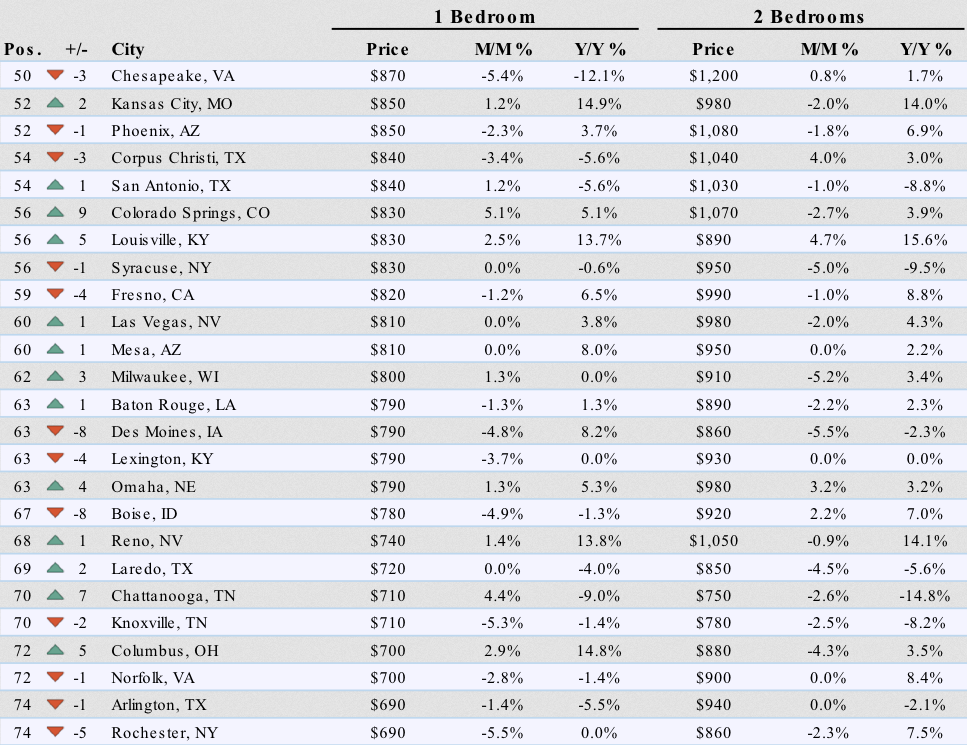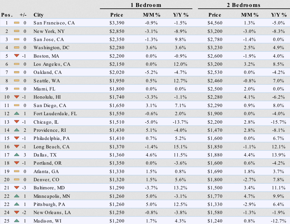 - In formerly red-hot Oakland, which received the San Francisco housing refugees, median one-bedroom and two-bedroom rents plunged 16% and 14% from their peak.