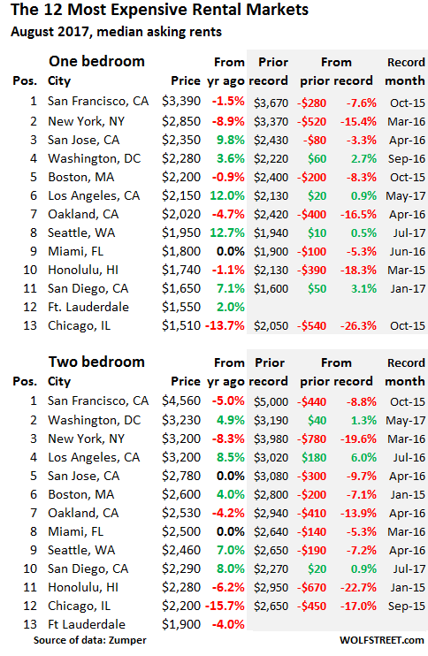 This table of the 12, well 13 now, most expensive major rental markets in the US shows median asking rents, their year-over-year changes, and (in the shaded areas) the prior record and the change since then: