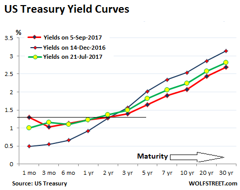 In this chart, today’s yields (red line) across the maturities contrast with the yields on December 14, 2016 (blue line), when the Fed got serious about tightening, and with yields on July 21 (green line). More on that green line in a moment. Note the hiccup in today’s yields at the left – the one-month yield and the inversion of the curve: