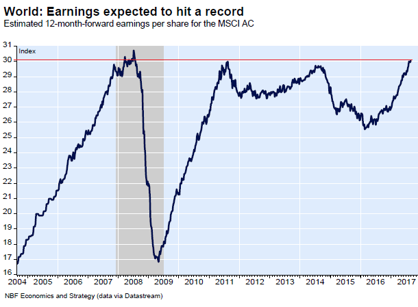 This chart by Economics and Strategy, National Bank of Canada, shows that roller-coaster ride of global forward earnings per share, their peak in 2008, the plunge during the Crisis, the V-shaped recovery until 2011, and then the earnings doldrums. The last few years were rough for earnings (I added the red line):