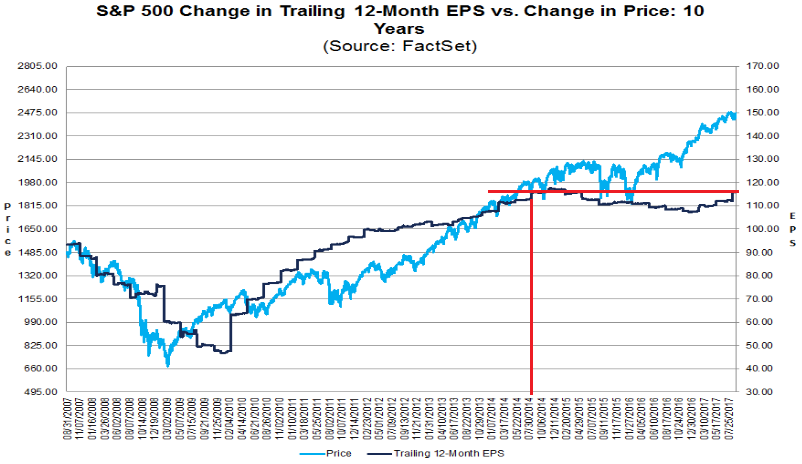 This chart shows those “adjusted” earnings per share for the S&P 500 companies (black line) and the S&P 500 index (blue line), via FactSet: