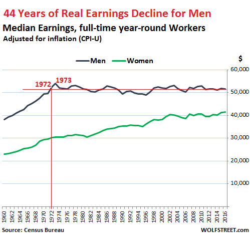 Median earnings for men who worked full-time year-round fell 0.4% in 2016, adjusted for inflation, to $51,640. On this inflation-adjusted basis, men had earned more than that in 1972 ($52,361). And it’s down 4.4% from the earnings peak in 1973 ($54,030). This translates into 44 years of real earnings decline: