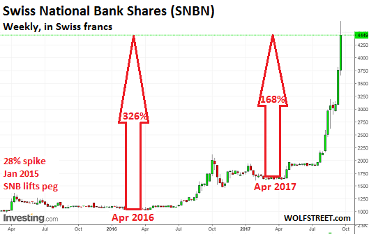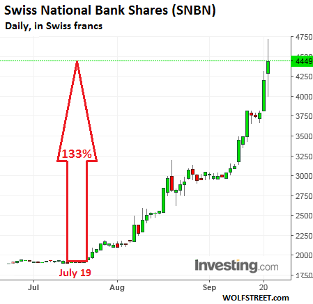 The article spread over the next three weeks. Other media outlets jumped on it. I mused about it on September 11. Today, it culminated with an article in the Wall Street Journal. And shares have skyrocketed another 1,620 francs since August 21, or 57% in one month.