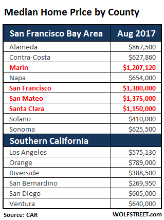 So how ludicrously high are home prices in the Bay Area compared to Southern California, where prices are already very high? (Data via the California Association of Realtors’ August report):