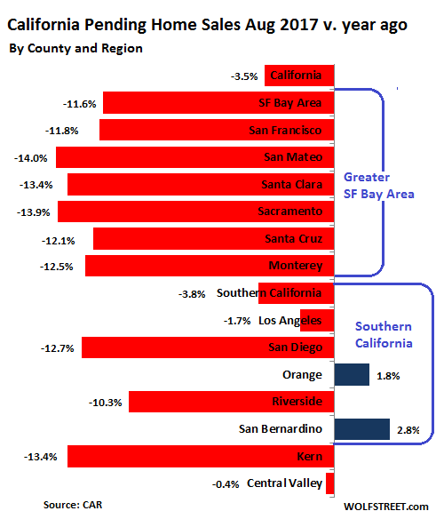 The biggest problem was the greater Bay Area, with pending home sales plunging 11.6% year-over-year, after having plunged 11.5% in July. It was the 11th month in a row of year-over-year declines. The counties of San Francisco, San Mateo, Santa Clara, Sacramento, and Santa Cruz all saw double-digit declines. Silicon Valley stretches across San Mateo and Santa Clara.