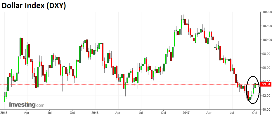 On September 8 intraday, the dollar index (DXY), which tracks the dollar against a basket of currencies, hit the lowest point since December 2014. In a little over eight months, it had dropped 12% from its intraday peak on January 3. But that was it. Since September 8, it has bounced nearly 3%. The chart shows the weekly movements: