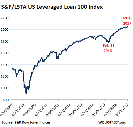 The leveraged loan market has been sizzling. The S&P/LSTA US Leveraged Loan 100 Index has now set an all-time high on every single day from September 25 through October 15. And that’s how it has been pretty much since the recent low on February 11, 2016: