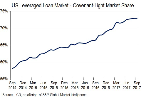 This chart shows the surge in the proportion of covenant-lite loans to total leveraged loans over the past three years: