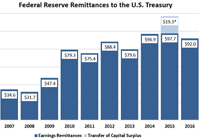 It works like this: The Fed gets the interest payments from the securities it holds (Treasuries and MBS). It uses part of this money to pay for its own operating expenses. The interest that the Fed pays the banks on their excess reserves is also paid out of this revenue stream. So what happens is that the amount of the remittances drops, as it did last year, and as it will drop more significantly for 2017. Here is a chart of those remittances through 2016 (in billion $):
