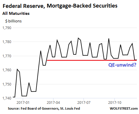 As part of QE, the Fed acquired residential MBS guaranteed by Fannie Mae, Freddie Mac, and Ginnie Mae. Now, as part of its $10-billion-a-month QE-unwind, the Fed is supposed to shed up to $4 billion a month in these MBS. And?