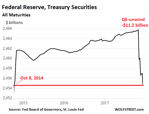 In October, the big day was October 31, when $8.5 billion of Treasuries on the Fed’s books matured. The Fed reinvested $2.5 billion and let $6 billion “roll off.” Hence, the amount of Treasuries fell by about $6 billion from an all-time record $2,465.7 billion on October 25 to $2,459.8 billion on November 1.