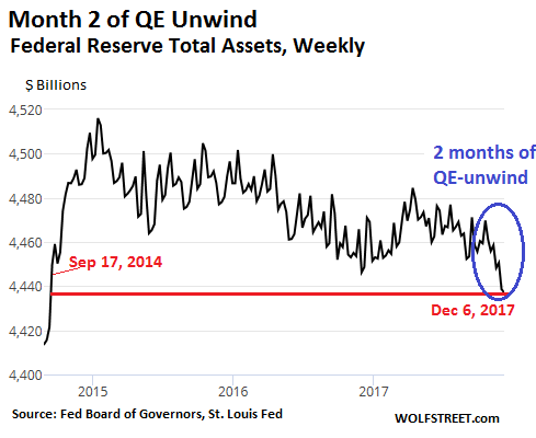 The Fed’s balance sheet for the week ending December 6, released today, completes the second month of the QE-unwind. Total assets initially zigzagged within a tight range to end October where it started, at $4,456 billion. But in November, holdings drifted lower, and by December 6 were at $4,437 billion, the lowest since September 17, 2014: