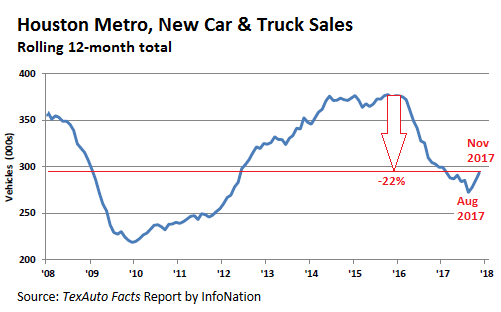 Today, TexAuto Facts released the November sales data, published by InfoNation, cited by the Greater Houston Partnership: New Vehicle sales in the Houston-area jumped 35.4% year-over-year to 30,670 vehicles. It was huge for a November. Compared to 2015, before the oil bust collided with the auto industry head-on, November 2017 sales were up 25%! The rolling 12-month total, at 293,614 vehicles, was still down 3.1% from the financial-crisis levels a year earlier (chart by the Greater Houston Partnership, red marks added):