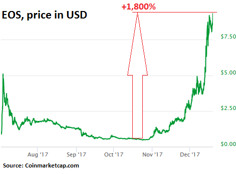 In mid-October, the price was still in the 50-cent range. So to people who bought at the time, it doesn’t matter that they own not even one iota of the company or its world-changing technology platform or whatever because since mid-October the price has multiplied by 19. That’s all that matters (via Coinmarketcap.com):
