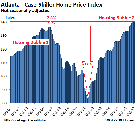 Home prices in Atlanta actually ticked down a smidgen from the prior month, but are still up 5.1% year-over-year and are 2.6% above the peak of Housing Bubble 1 in July 2007. From that peak, the index plunged 37%. It’s now up 70% since February 2012: