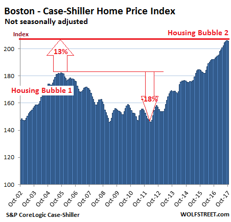 The index for the Boston metro area ticked down on a monthly basis, the first decline after 22 months in a row of increases. It’s still up 6.9% year-over-year, a slightly slower pace then the 7.2% year-over-year surge in the prior month. During Housing Bubble 1, it soared 82% from January 2000 to October 2005, before the plunge set in. Now, after six years of relentless price increases, the index exceeds the peak of Housing Bubble 1 by 12.7%: