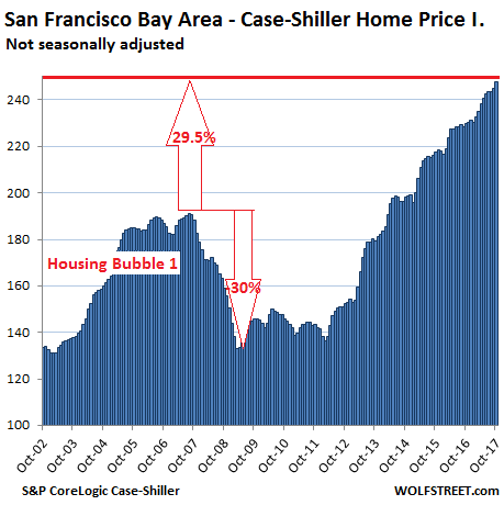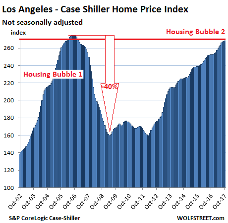 No. So you can strip it out. According to the Fed’s preferred inflation measure (core PCE), there has been 17.7% inflation since the totally insane peak of Housing Bubble 1. Deduct 17.7% from the CaseShiller indices, and you will see that several of the indices EXCEED the prior totally crazy bubble levels even after inflation, and that the rest are getting closer. Those peak levels were the ones that imploded with fanfare. They weren’t some normal state of calm. They were the very edge of Housing Bust 1.