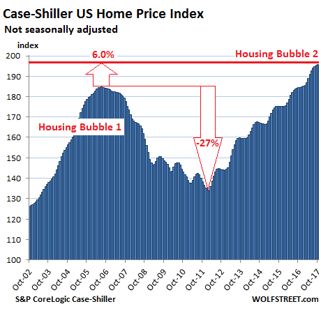 The S&P CoreLogic Case-Shiller National Home Price Index for October, released this morning, jumped 6.2% year-over-year (not-seasonally-adjusted), up from 6.1% in September. The index has now surpassed by 6.0% the crazy peak in July 2006 of Housing Bubble 1 and is up 46% from the trough of Housing Bust 1: