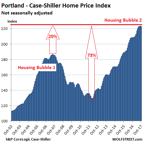 The Case-Shiller index for Portland declined a tad, and is now back where it had been three months ago — the first monthly decline since September 2016, and in line with seasonal price patterns. The index is up 7.1% year-over-year and 73% in five years. It is now 20% above the crazy peak of Housing Bubble 1 and has ballooned 123% since 2000: