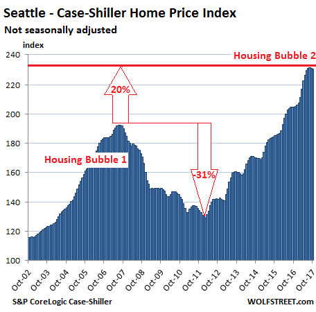 The Case-Shiller home price index for the Seattle metro declined again by a tad on a month-to-month basis — first back-to-back declines since the end of 2014! However, the index is not seasonally adjusted, and a slight downturn this time of the year was not unusual before 2015. So this may be a sign that the housing market in Seattle is returning to some seasonal patterns, rather than just spiking no matter what. The index is up a breath-taking 12.7% year-over-year, 20% from the peak of Housing Bubble 1 (July 2007), and 79% from the trough of Housing Bust 1 in February 2011: