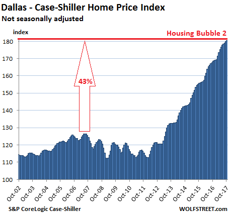 The index for the Dallas-Fort Worth metro rose again on a monthly basis — the 45th month in a row of increases. It is up 7.1% year-over-year and 43% from the prior peak in June 2007. Similar to Denver, Housing Bubble 1 and Housing Bust 1 mostly spared North Texas. But prices began to surge in 2012: