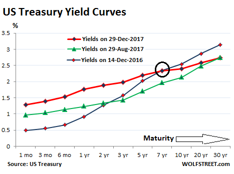 This is where 2017 ends. 2018 will likely be the year when the effects of the Fed’s “balance sheet normalization” appear more clearly – including a yield curve that will change course, and instead of inverting, will start to tilt up at the long end, as longer-dated bonds are starting to sell off, in line with the moves at the shorter end. This would put to rest the fears about an inverted yield curve, but the selloff in longer-dated Treasuries would be a painful experience for coddled bondholders.
