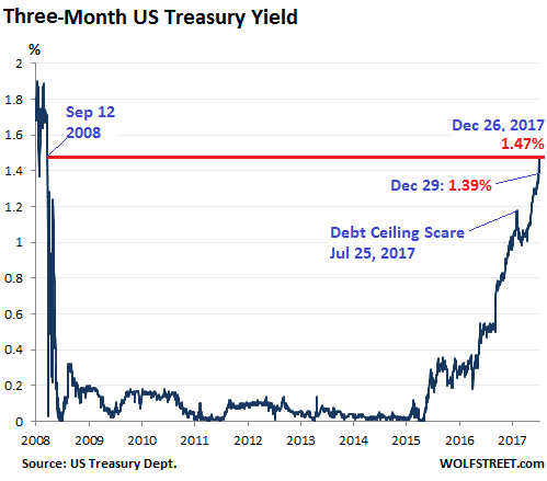 The price of three-month Treasury securities fell and the yield — which moves in the opposite direction — rose, ending the year at 1.39%, after having spiked to 1.47% on December 26, the highest since September 12, 2008. This is in the upper half of the Fed’s new target range for the federal funds rate (1.25% to 1.50%). Back in October 2015, the yield was still at 0%: