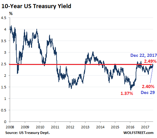 Even the 10-year yield has ticked up lethargically over the past few weeks, reaching 2.49% on December 22. That’s still down from earlier this year when it flirted with yields above 2.6%. But it’s the highest since March 16, and it’s up by over a full percentage point from the historic low of 1.37% in August 2016. The 10-year yield closed the year at 2.40%: