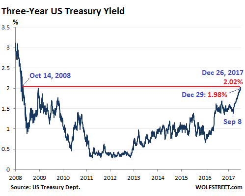 And two, the relationship between the red line and the green line (yields on August 29, 2017) shows that the very long end – the 30-year yield – has stopped falling since the end of August, and all other yields have risen, with the mid-section rising the most. This includes the recent surge in the three-year yield noted above.