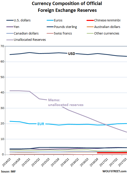 Not all central banks disclose to the IMF how their foreign exchange reserves are allocated. In Q3 2017, 14.6% of the reserves hadn’t been allocated. But this number is plunging. In Q3 2014, just three years ago, it was still 41.2%. This means that more and more central banks report to the IMF their allocation of foreign exchange reserves, and the COFER is getting broader.