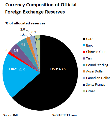 While the euro has become a major force, it has replaced the Deutsche mark and other European currencies, and so the net impact on the dollar’s hegemony wasn’t huge. The Chinese yuan, which some folks thought would pull the rug out from under the dollar, is barely visible in the mix. And folks eagerly waiting for the “death of the dollar,” the “end of the dollar hegemony,” and similar mayhem will need to be patient.