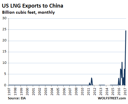 In 2017, the US became a net exporter of natural gas for the first time. It started small in February, when the US exported 1 billion cubic feet more than it imported. By October, the last month for which data from the Energy Department’s EIA is available, net exports surged to 45 billion cubic feet. For the first 10 months of 2017, the US exported 86 billion cubic feet more than it imported. And this is just the beginning.