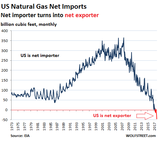 This chart shows net imports (imports minus exports) of US natural gas. Negative “net imports” (red) mean that the US exports more than it imports: