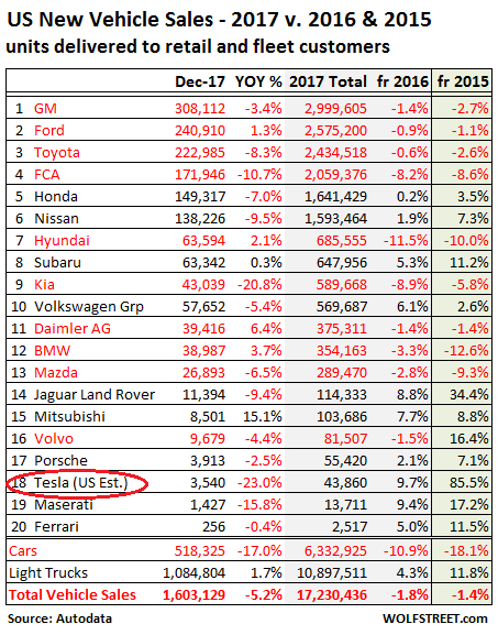 Autodata estimated that Tesla delivered just 3,450 units in the US in December, down 23% from a year ago. For the whole year, Autodata estimated that Tesla sold 43,860 units, up 9.7%. This gives Tesla a share of 0.2% of the 17.2 million units sold in the US, behind another niche manufacturer of expensive cars: Porsche (55,420 sales in 2017).