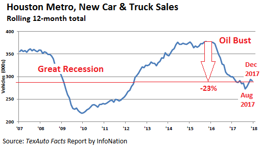 It brought sales for the rolling 12-month period to 290,354 new vehicles, according to TexAuto Facts, published by InfoNation, and cited by the Greater Houston Partnership. This was down 3% from the oil-bust levels in 2016, and down 23% from the levels of 2014 and 2015 (chart via Greater Houston Partnership, red marks added):
