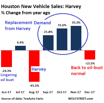 After collapsing by 45.5% in August, as Hurricane Harvey was hitting, new-vehicle sales boomed in September, October, and November, but not nearly enough to pull US new-vehicle sales out of their funk. And by then, the fuel had been burned.