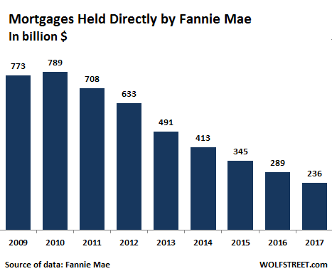 But even as Fannie Mae’s exposure to mortgage backed securities (MBS) has grown to over $3 trillion, it has quietly taken its portfolio of directly held mortgages from $789 billion at the end of 2010 to $236 billion by November 2017 under a mandate from the FHA: