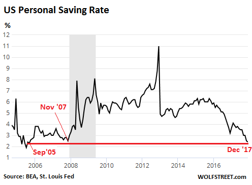 Many households spend more than they make. For them, the personal saving rate is a negative number. This negative personal saving rate translates into borrowing, which explains the 5.7% year-over-year surge in credit card debt, and the 5.5% surge in overall consumer credit.
