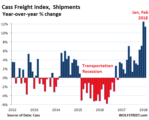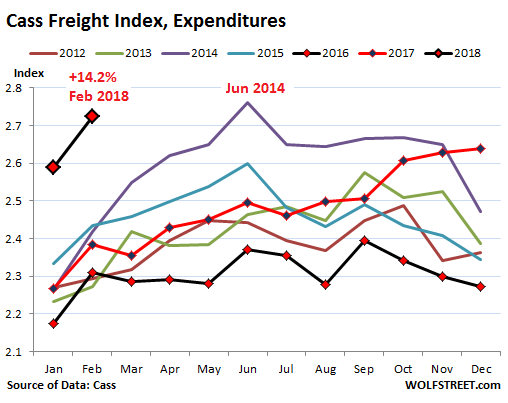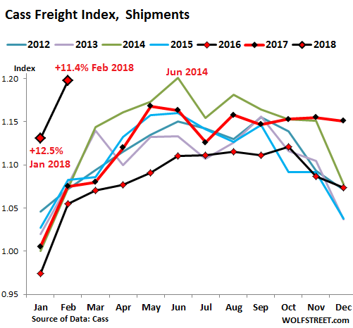 And this is what has been happening in the transportation sector in the US: Shipment volumes by all modes of transportation combined — truck, rail, air freight, and barge — surged 11.4% year-over-year in February according to the Cass Freight Index. The index, which is not seasonally adjusted, hit its highest level for any February since 2006: