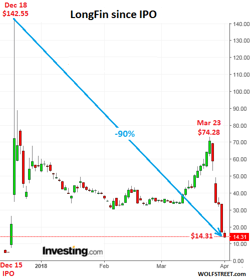 Shares of “blockchain” company LongFin (LFIN) plunged 17% today to $14.31, the sixth trading day in a row of plunges. Intraday on Friday, March 23, shares still traded at $73. The astonishing thing isn’t that they’ve plunged 81% over those six trading days, but that they had more than doubled over the prior two weeks, and that they’re still trading above penny-stock status to begin with.