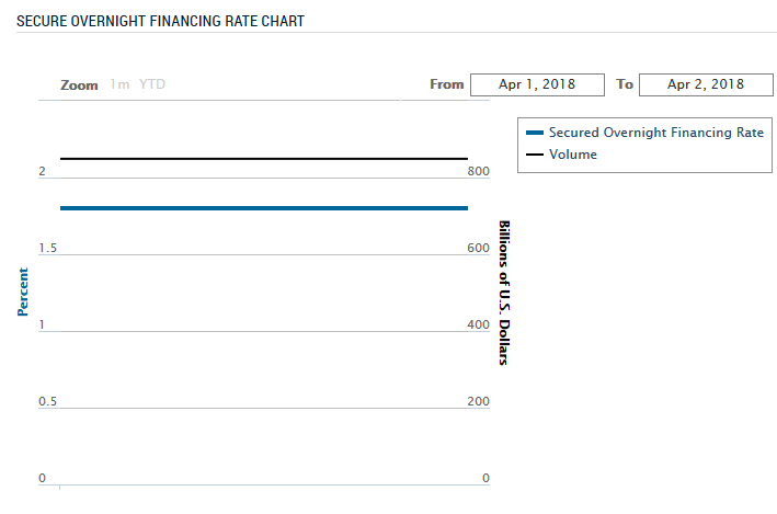 This morning’s rate, the first one, is based on $849 billion in overnight transactions from April 1 to April 2. So unlike LIBOR, this rate is based on hundreds of billions of dollars in actual transactions, and not on opinions of what the rate might be. And that rate is – massive drum roll please – 1.80%. The chart, since it only covers the first day, shows a straight line. Over time, the line will become jagged: