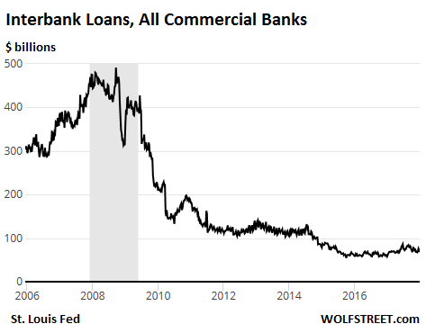 And yet, despite this gargantuan amount that is based on the dollar LIBOR, actual borrowing between all commercial banks has plunged from nearly $500 billion at the peak before and during the Financial Crisis to just $68 billion in February, when the St. Louis Fed stopped updating the data as interbank loans have become an irrelevant indicator of anything other than that banks are awash in cash and don’t need to borrow from each other: