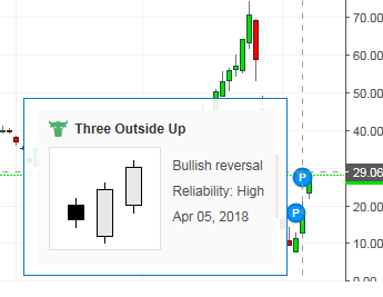 The blue circles with “P” inscribed in the chart appeared on April 4 and April 5. When you hover over them on the Investing.com website, a box pops up with some technical analysis: “Bullish reversal. Reliability: High,” just before the dream went POOF at 10:30 a.m. on April 6. Here’s the April 5 box: