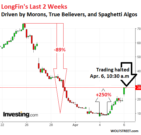 But by April 4, the true believers, morons, and spaghetti-code algos piled into the shares again and drove up the price 250% in three days. Of course, this is only a theoretical value. In reality, they’re stuck with the shares, now most likely worthless if they ever start trading again, at a time when the company in the US, given the SEC’s actions, will likely disappear.