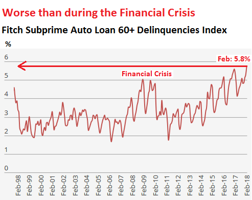 And it doesn’t when customers, buckling under these double-digit interest rates and too much car, start defaulting in massive numbers. Subprime loans started to be a fiasco that we have been covering at least since February 2016. This has been a slow-motion wreck.