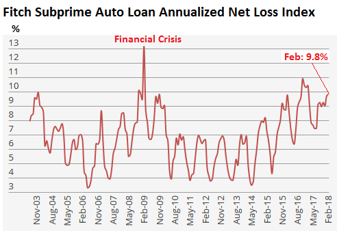 Given the losses in the sector over the past two years, specialized lenders started cutting back. This prevented many subprime customers from buying new vehicles, which was one of the primary reasons why new-vehicle sales in 2017 fell below the total of 2015. This is also why Fitch’s index of subprime auto loan Annualized Net Losses (ANL) peaked in late 2016 and early 2017 and has since backed off just a tad though it remains at financial crisis highs, at 9.8% in February: