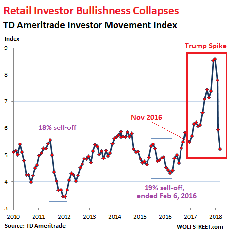 This wholesale collapse of retail investors’ enthusiasm for exposure to the market followed a breath-taking spike that had kicked off at about the time of the election in November 2016. Between that point and the final paroxysm in the stock market on January 26, the S&P 500 surged 35%. Retail investors went all in, and their enthusiasm boiled over, as stocks essentially just rose day after day in one of the least volatile periods in market history. So this is what the breath-taking one-year surge and the even more breath-taking three-month collapse of retail investor bullishness looks like – a near-perfect spike, but a lot steeper on the way down: