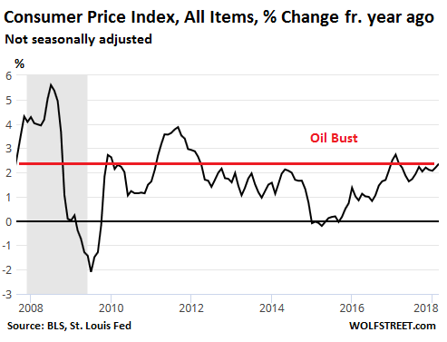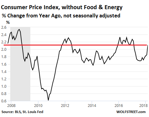 Energy was up 7% from a year ago, with gasoline up 11%, which people have started to notice at the pump. When the all-items CPI surges, it’s usually blamed on food and energy prices, which are volatile. So these prices are eliminated to get a view of “core” inflation. But even core CPI in March rose 2.1% from a year ago, the sharpest increase since February 2017: