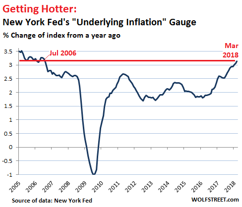 After the Bureau of Labor Statistics released its Consumer Price Index for March this morning, including a hotter-than-expected (or feared) reading for the core Consumer Price Index – more on that in a moment – several other inflation gauges were released, all based on various ways of analyzing the data pile of the BLS. This includes the New York Fed’s “Underlying Inflation Gauge,” which hit the highest level since July 2006.